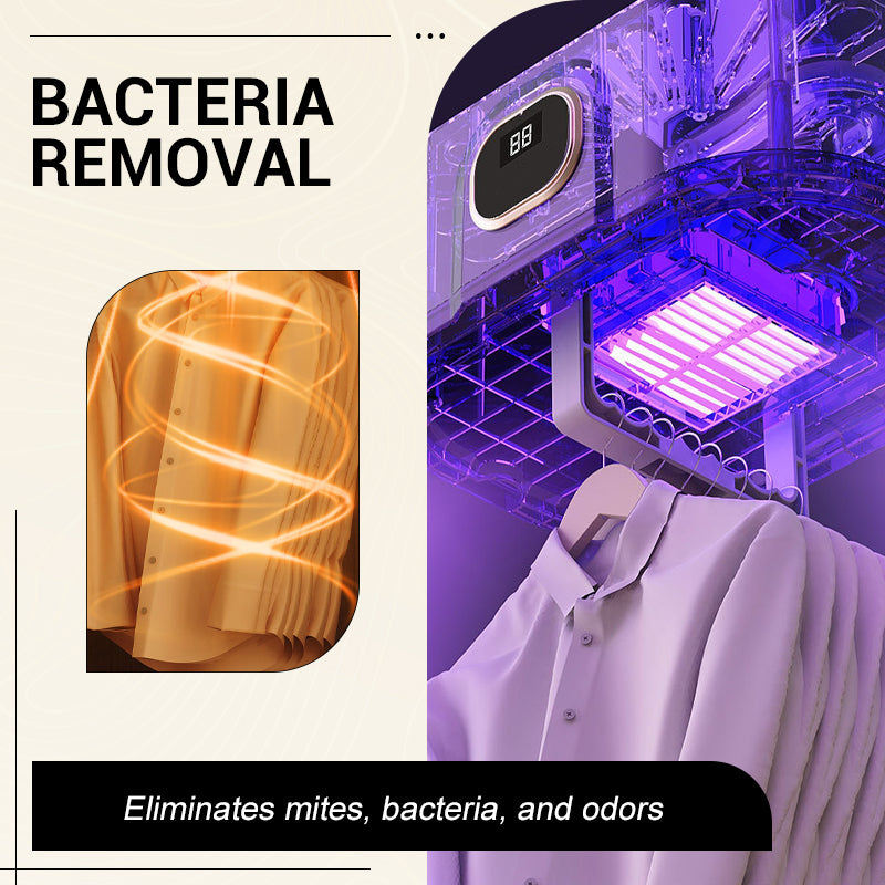POUVOIR ASSAINISSANT – Plus qu'un simple séchage, l'appareil contribue à maintenir la propreté. L'air chaud élimine les bactéries et les acariens, tandis que la technologie à ions négatifs intégrée neutralise les odeurs. Ainsi, vos vêtements sont non seulement secs, mais aussi hygiéniques et sentent bon.